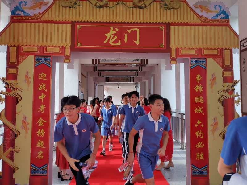 龍崗六約學校全體行政人員與九年級老師,穿著紅色送考服送考,寓意“鴻運當頭”。九年級學生走過龍門,踏上紅地毯,自帶炫酷出場bgm。(記者李麗、周紅聲)