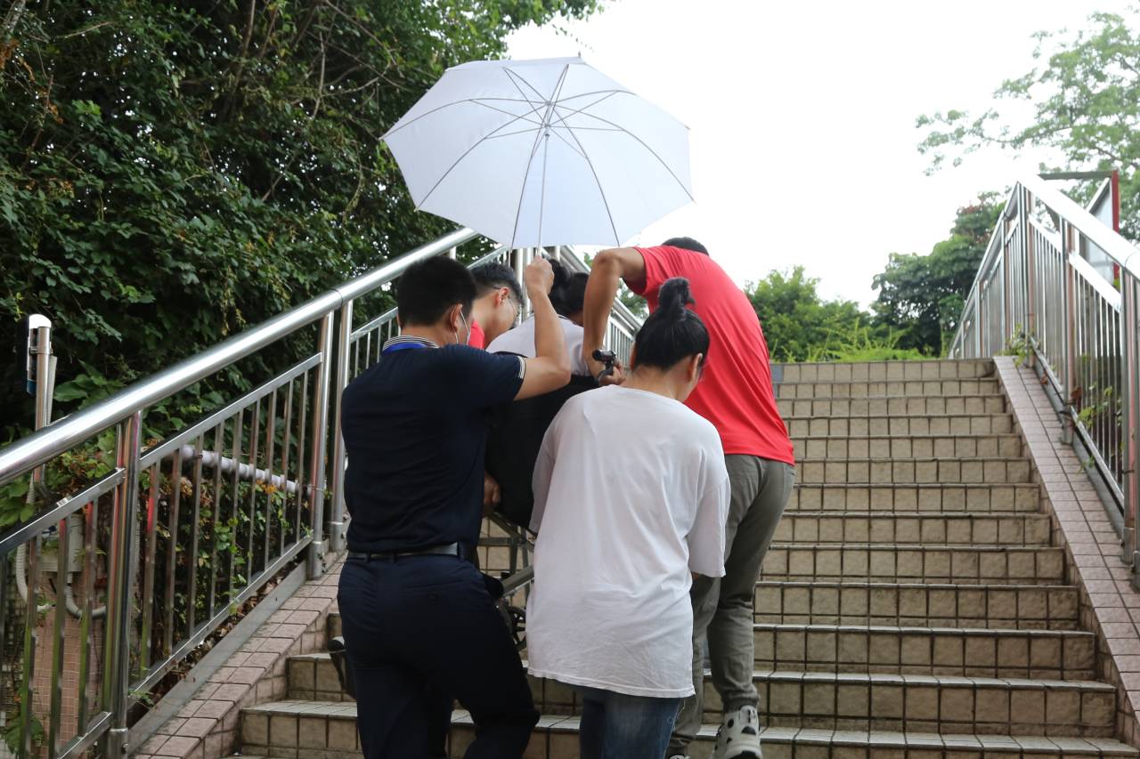 東升學(xué)校考點(diǎn)有一位行動(dòng)不便的考生,學(xué)校派三名工作人員提前護(hù)送考生到考場(chǎng)。 (記者李麗