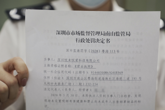 在深圳市市場(chǎng)監(jiān)督管理局南山分局粵海所,記者看到企業(yè)法人現(xiàn)場(chǎng)接受行政處罰決定書(shū),對(duì)于違法行為,該負(fù)責(zé)人表示“已經(jīng)進(jìn)行整改”。