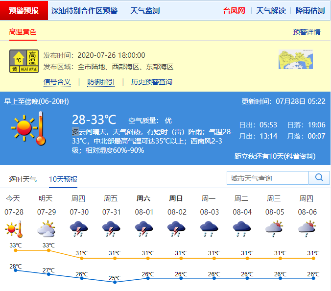 見(jiàn)圳客戶端?深圳新聞網(wǎng)2020年7月28日訊 根據(jù)深圳氣象局官方消息,7月28日白天多云間晴天,天氣悶熱,有短時(shí)(雷)陣雨;氣溫28-33℃,中北部最高氣溫可達(dá)35℃以上;西南風(fēng)2-3級(jí);相對(duì)濕度60%-90%。