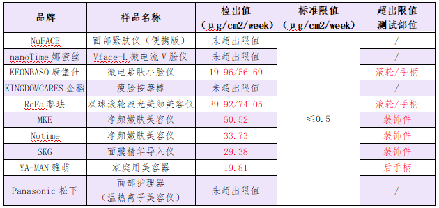 值得注意的是,在測試的10款家用美容儀樣品中6款樣品鎳釋放量測試結果不符合歐盟REACH法規(guī)要,包括KEONBASO康堡仕微電緊膚小臉儀、ReFa黎琺雙球滾輪波光美顏美容儀、MKE凈顏嫩膚美容儀、Notime凈顏嫩膚美容儀、SKG面膜精華導入儀、YA-MAN雅萌家庭用美容器。