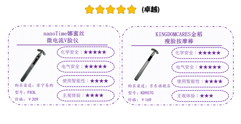 經(jīng)測試,綜合化學安全、電氣安全、使用智能性、主觀體驗等消費者關心的多個維度,2款微電流型家用美容儀和1款電離子型美容儀品質領跑表現(xiàn)卓越,分別為,國產(chǎn)品牌nanoTime娜蜜絲F83L微電流V臉儀和KINGDOMCARES金稻 KD9070瘦臉按摩棒;日本品牌Panasonic松下 EH-ST50面部護理器(溫熱離子美容儀)。