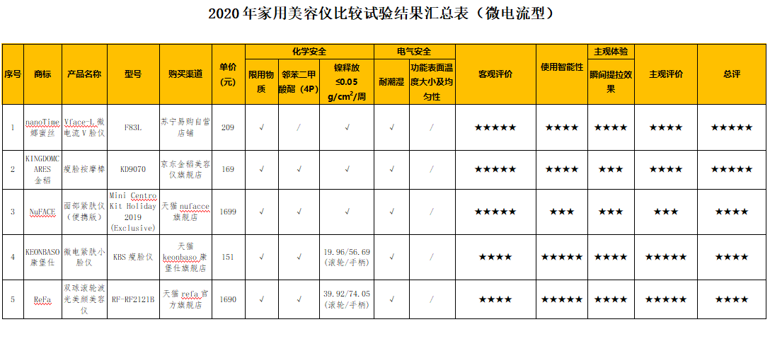 附:2020年家用美容儀比較試驗結果匯總表(微電流型/電離子型)