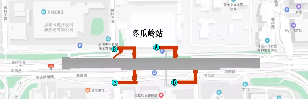 冬瓜嶺站地處福田區(qū)天威視訊附近,車站沿規(guī)劃福田彩田路南北向布置,車站為地下二層一島一側(cè)式站臺鋼筋混凝土箱形框架結(jié)構(gòu)。車站共設(shè)出入口7個:A、B、C、D、3個物業(yè)出入口(E、F、G口)。