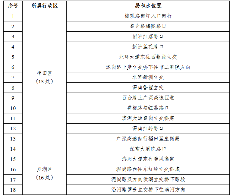 根據(jù)深圳市氣象局等權(quán)威部門發(fā)布的易積水路段匯總信息,深圳全市范圍暴雨天氣易積水路段如下,其中,東環(huán)一路、新洲路、文錦北路等路段周邊積水相對(duì)密集,請(qǐng)市民朋友小心留意,注意安全。