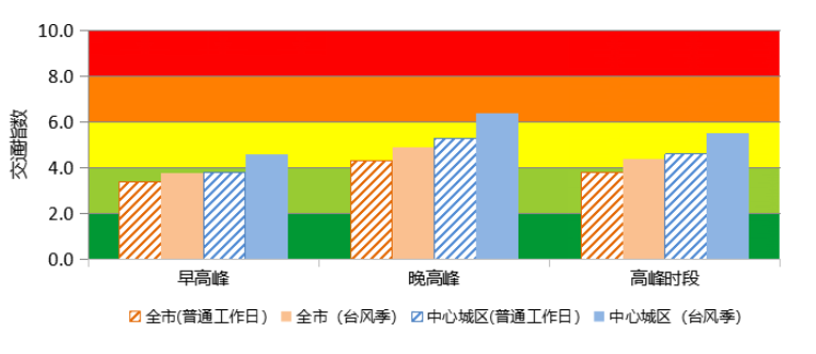 根據(jù)往年數(shù)據(jù)分析,臺(tái)風(fēng)季期間受降雨影響,工作日深圳全市早、晚高峰時(shí)段道路交通運(yùn)行指數(shù)將有所上升,預(yù)計(jì)工作日高峰時(shí)段全市交通運(yùn)行水平處于“緩行”等級(jí),通勤時(shí)長(zhǎng)將比普通工作日多花費(fèi)30%左右。其中,中心城區(qū)受降雨影響較大,早、晚高峰運(yùn)行速度下降將較明顯。