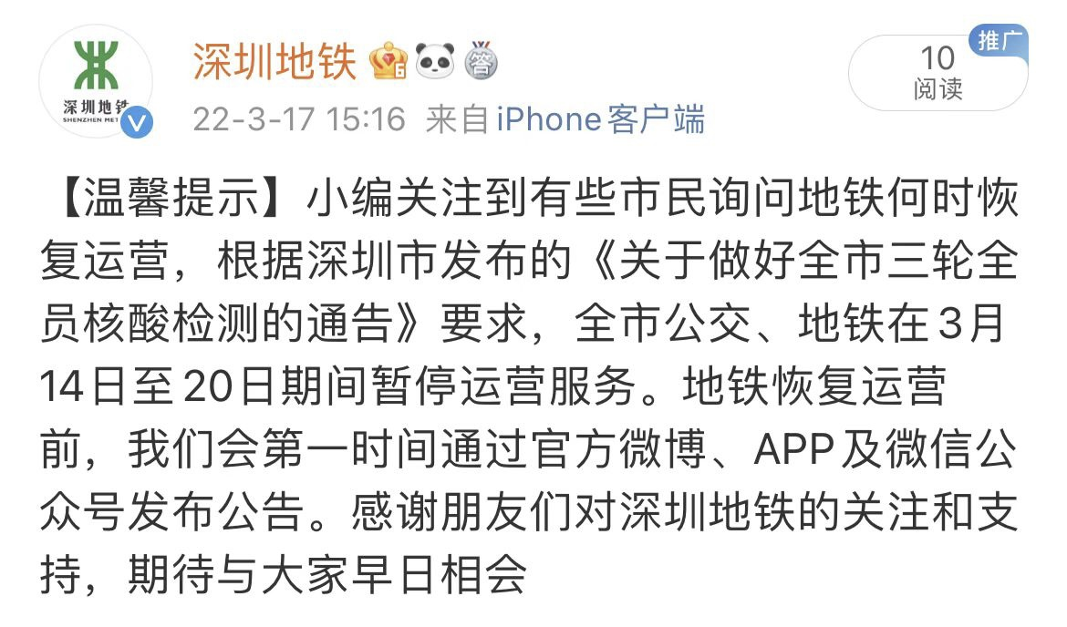 對此,記者向深圳地鐵求證,深圳地鐵表示,根據(jù)深圳市發(fā)布的《關(guān)于做好全市三輪全員核酸檢測的通告》要求,全市公交、地鐵在3月14日至20日期間暫停運(yùn)營服務(wù)。地鐵恢復(fù)運(yùn)營前,深圳地鐵會第一時間通過官方微博、APP及微信公眾號發(fā)布公告。