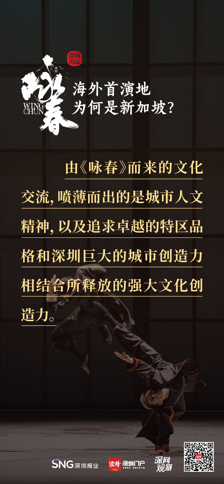 從《詠春》看深圳,背后是堅定和對于理想的熱忱,舞劇《詠春》的故事因“英雄”而來,由“追光者”展開,最終落在“理想”上,這與深圳“奮斗拼搏”的城市精神一脈相承;從《詠春》看文化,舞劇《詠春》以同根同脈的民族親情和自立自強的中華兒女本色為立意,塑造了以廣東武學宗師為代表的“中國英雄”形象,以及“扶弱小以武輔仁”的尚武崇德精神,催生出“詠春熱”的文化新景觀;從《詠春》看交流,深圳到新加坡的直線距離大約是 2607公里,新加坡作為一個擁有四分之三華人人口的國家,中華傳統(tǒng)文化在當?shù)厝A人社會的影響深遠,“仁”“禮”等思想在文化傳播的過程中無不體現(xiàn)中國傳統(tǒng)文化的特色與標記。在文化現(xiàn)代性轉(zhuǎn)化的當下,《詠春》創(chuàng)新性融合了國家級非遺與嶺南民俗文化,突出嶺南文化傳承創(chuàng)新與中國傳統(tǒng)現(xiàn)代表達,向世界講述新時代的深圳故事、中國故事。在傳統(tǒng)與現(xiàn)代文化交融的新加坡,舞劇《詠春》必能閃耀更多的光芒,走進更多人的心里。