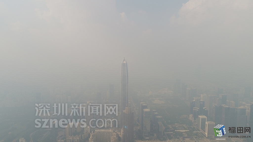 無人機在數百米高空俯瞰灰霾籠罩下的深圳中心區(qū),大半個城區(qū)都看不清楚。