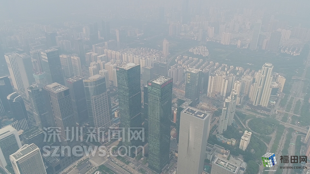 無人機在數(shù)百米高空俯瞰灰霾籠罩下的深圳中心區(qū),大半個城區(qū)都看不清楚。