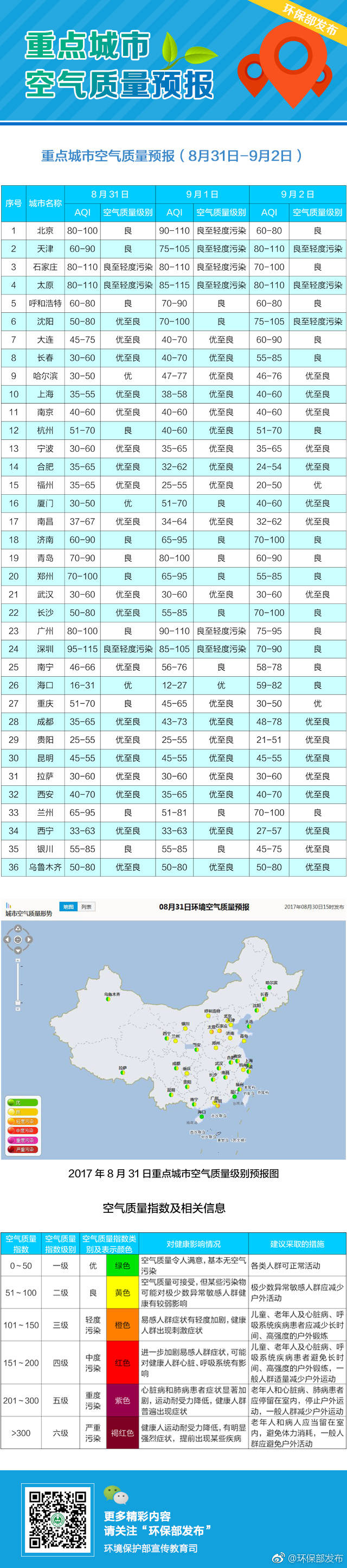環(huán)保部宣傳教育司微博發(fā)布的空氣質量分級及應對措施。