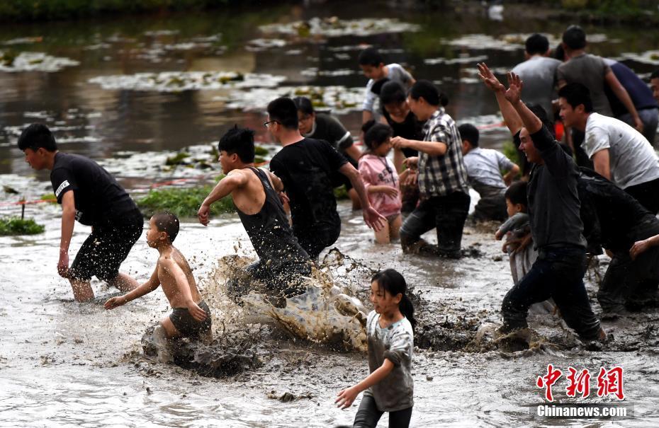 3月17日,福建省龍巖市連城縣莒溪鎮(zhèn)璧洲古村落內(nèi),一場“抓魚鬧春田”的活動吸引了許多市民前來參與。圖為民眾在泥塘的渾水中抓魚。中新社記者 張斌 攝