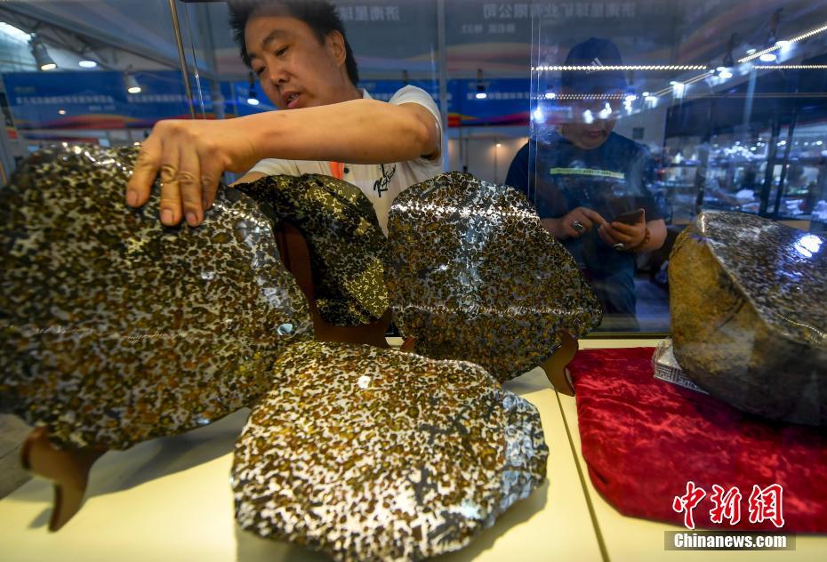 6月15日,第十一屆新疆觀賞石、和田玉精品博覽會(huì)在位于新疆烏魯木齊市紅光山的新疆國(guó)際會(huì)展中心開(kāi)幕,本次博覽會(huì)參展種類(lèi)涵蓋珠寶、玉石、礦石、隕石、觀賞石等,吸引眾多奇石玩家到場(chǎng)“以石會(huì)友”,打造獨(dú)具特色的“品石”盛宴。圖為一展位前的橄欖隕石切片吸引隕石收藏者。中新社記者劉新 攝