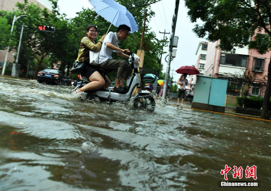 7月16日下午,河北石家莊一條馬路積水嚴重,民眾涉水騎行。當日,該省氣象臺發(fā)布暴雨藍色預警,承德、雄安新區(qū)、廊坊北部、石家莊中西部、邢臺西部等多地遭受暴雨襲擊。中新社記者翟羽佳 攝