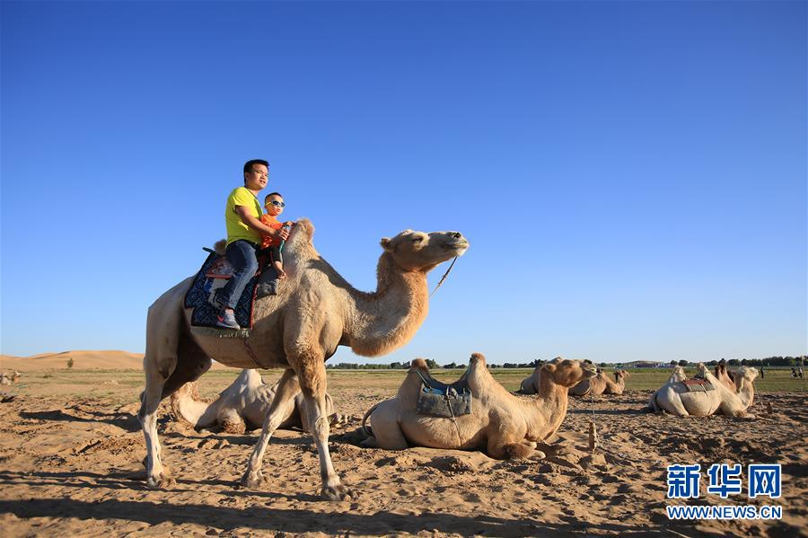 7月25日,一對(duì)父子在庫(kù)布其沙漠七星湖景區(qū)體驗(yàn)騎駱駝。