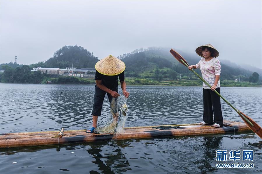 8月2日,淳安縣汾口鎮(zhèn)紅星村的漁民乘著竹排,在千島湖的支流武強(qiáng)溪上收網(wǎng)撈魚。新華社記者 徐昱 攝