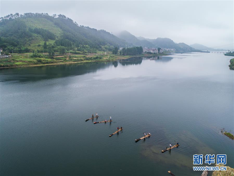 8月2日,淳安縣汾口鎮(zhèn)紅星村的漁民捕撈結(jié)束后,在千島湖的支流武強(qiáng)溪進(jìn)行劃竹排比賽(無人機(jī)拍攝)。新華社記者 徐昱 攝