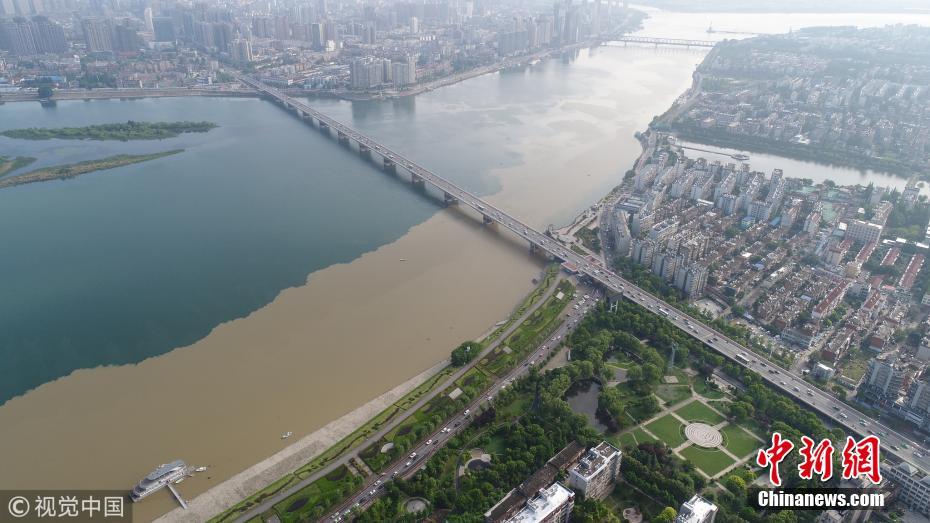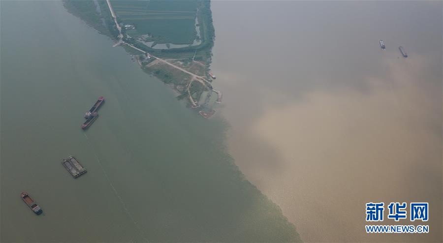 7月10日,航拍長(zhǎng)江與南京秦淮河交匯處,江水與河水“涇渭分明”。當(dāng)日,江蘇水利廳發(fā)布的水情信息顯示,長(zhǎng)江南京段水位已降至警戒線以下。中新社記者泱波 攝