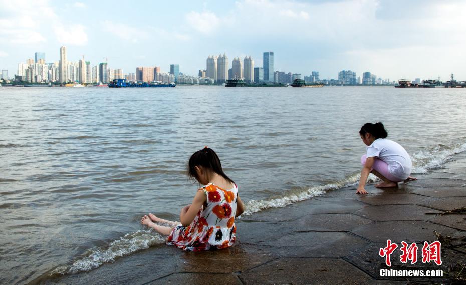 7月14日,在漢口江灘江邊,兩位小朋友岸邊戲水游玩。近日,長江武漢段水位呈快速上漲趨勢,江水已漫上親水平臺。中新社記者 張暢攝