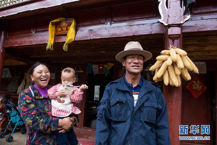 寧蒗永寧鄉(xiāng)泥鰍溝村委會八珠村民小組的摩梭人阿普私根(右)站在自家門口(7月30日攝)。他家是摩梭母系家庭重點(diǎn)保護(hù)民居,依靠旅游服務(wù)等家庭年收入近20萬元。新華社記者 胡超 攝
