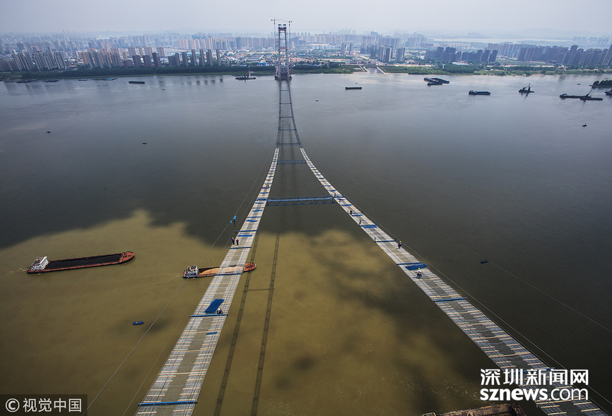 長(zhǎng)江上空架“天梯” 武漢楊泗港長(zhǎng)江大橋臨時(shí)“吊橋”形成