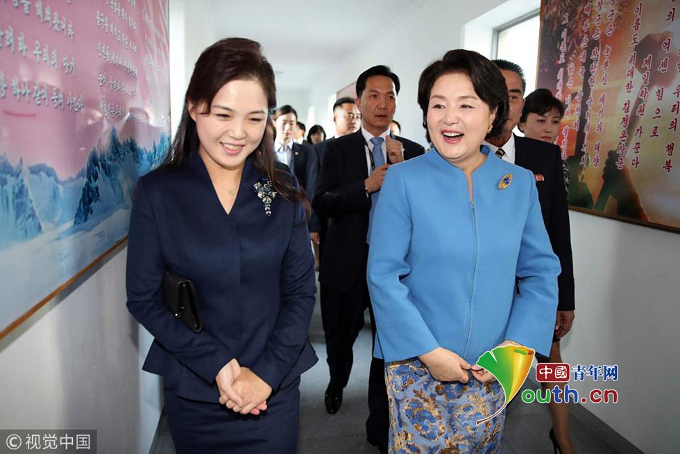 當(dāng)?shù)貢r(shí)間2018年9月18日,朝鮮平壤,韓國(guó)總統(tǒng)文在寅夫人金正淑在朝鮮國(guó)務(wù)委員會(huì)委員長(zhǎng)金正恩夫人李雪主的陪同下參觀平壤金元均音樂(lè)大學(xué)。圖片作者:視覺(jué)中國(guó)