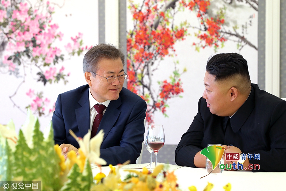 當(dāng)?shù)貢r(shí)間2018年9月20日,朝鮮,韓國(guó)總統(tǒng)文在寅在三池淵招待所和金正恩夫婦一起共進(jìn)午餐。圖片作者:Yonhap News Agency/視覺(jué)中國(guó)