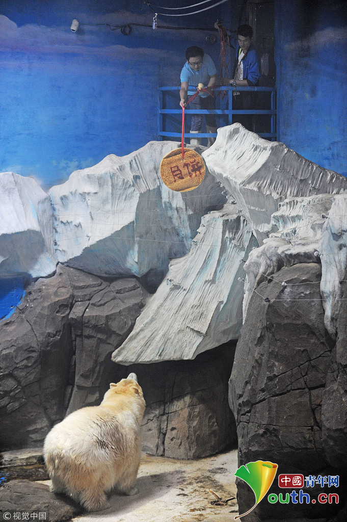 2017年9月29日,武漢海昌極地海洋公園里,北極熊“靜靜”翹首以盼為自己準(zhǔn)備的“專屬月餅”。