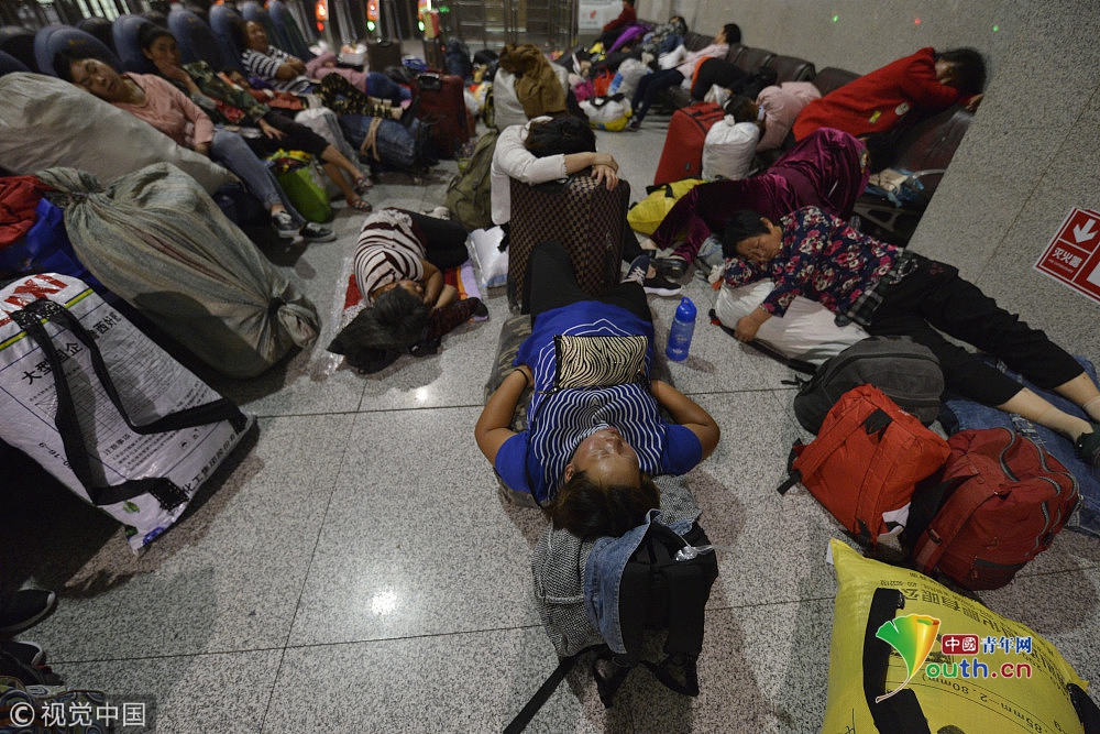 2018年9月15日,在鄭州火車站候車大廳,來自周口西華縣農(nóng)村的數(shù)百名采棉工,為趕早上4點(diǎn)50分的火車,在火車室打地鋪休息。