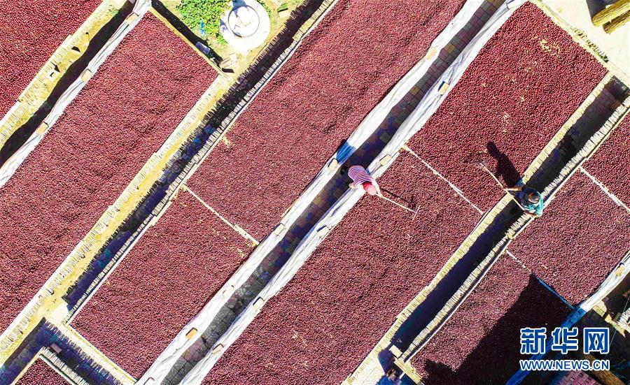 9月22日,河北省棗強縣棗強鎮(zhèn)孟家莊村的棗農在晾曬紅棗。 近日,河北省棗強縣的2000多畝棗園迎來收獲季,棗農們搶抓農時,采摘、篩選、晾曬紅棗,樂享秋收的快樂。 新華社記者李曉果攝