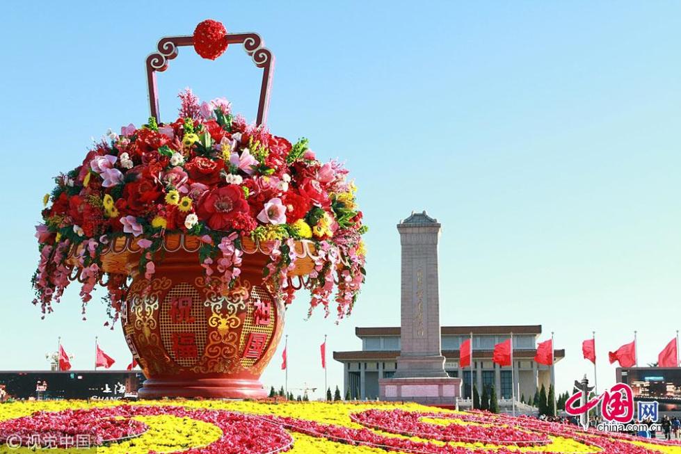 昨天(23日)上午,天安門廣場“祝福祖國”大花籃組裝完成,展現(xiàn)在游客面前。花壇頂高17米,底部直徑50米,花籃里插放大量富有吉祥寓意的仿真花朵,最大的一朵直徑達(dá)到4米左右,重達(dá)150公斤,用形如紅心的紅掌組合而成,寓意紅心向黨、團(tuán)結(jié)凝聚在一起。天安門廣場兩側(cè)綠地上設(shè)置了12根花柱、18個花球及3800平方米花帶。