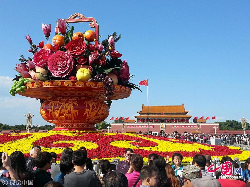 2013年天安門廣場首次以花果籃的形式布置國慶主花壇,國慶花籃名為“祝福祖國”,高達(dá)18.2米,籃盤直徑達(dá)到15米,中心花壇直徑達(dá)到50米,是天安門廣場歷年最大的花籃。本次的花果籃使用牡丹、玉蘭、松枝、竹子四個品種的大型仿真花,并創(chuàng)新融合石榴、蘋果、蟠桃、葡萄等水果造型,表達(dá)了富貴吉祥、平安幸福、節(jié)節(jié)高升等良好寓意。除了仿真的花果,施工方還在花果籃中穿插擺放大規(guī)格三角梅、一品紅等盆栽花卉。據(jù)了解,本次花果籃內(nèi)的三角梅是首次進(jìn)入天安門國慶花壇主景。此外,“籃子”采用玻璃鋼材料,可以重復(fù)利用。 據(jù)了解,如此巨大的花果籃可抵抗10級大風(fēng)。