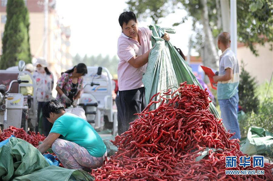 9月16日,阜城縣王集鄉(xiāng)南張莊村農(nóng)民在整理收獲的辣椒。近年來,河北省阜城縣王集鄉(xiāng)在推進產(chǎn)業(yè)富民過程中,積極引導農(nóng)民調(diào)整農(nóng)業(yè)產(chǎn)業(yè)結(jié)構(gòu),按照品種特色化、種植規(guī)?;a(chǎn)銷一體化的“公司+基地+農(nóng)戶”的經(jīng)營模式,鼓勵農(nóng)民發(fā)展特色辣椒種植,推行“訂單種植”模式,開辟出了一條農(nóng)民創(chuàng)收新路徑。目前,阜城縣王集鄉(xiāng)辣椒種植面積3100余畝,每畝年收益2500元以上,帶動當?shù)剞r(nóng)民實現(xiàn)增收。新華社記者朱旭東攝