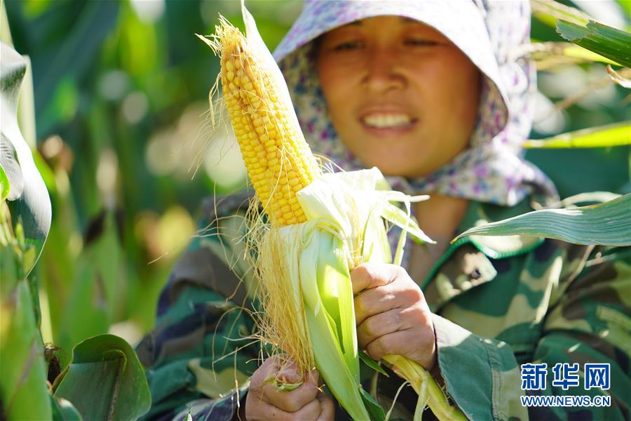 9月23日,河北省灤縣茨榆坨鎮(zhèn)西長坨村農民賈麗萍在展示收獲的玉米。
