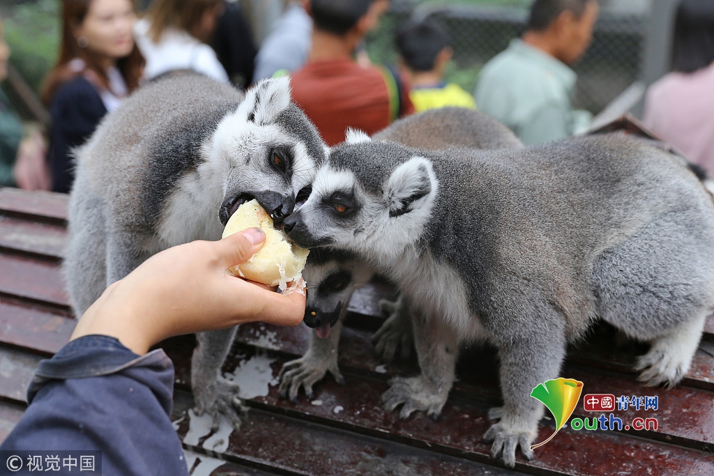 2017年10月4日,重慶永川樂和樂都的動物飼養(yǎng)員給環(huán)尾狐猴喂食月餅。