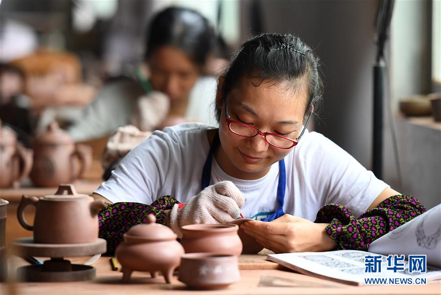 10月9日,欽州市一家廣西坭興陶生產企業(yè)的員工在制作坭興陶產品。 新華社記者 陸波岸 攝