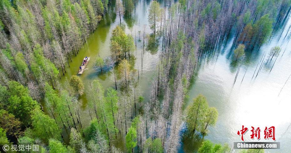 10月5日,航拍安徽宣城寧國方塘鄉(xiāng)汪村青龍湖港口灣水庫,游客們泛舟湖上,穿梭于紅杉林中,享受秋日的美好時光。 圖片來源:視覺中國