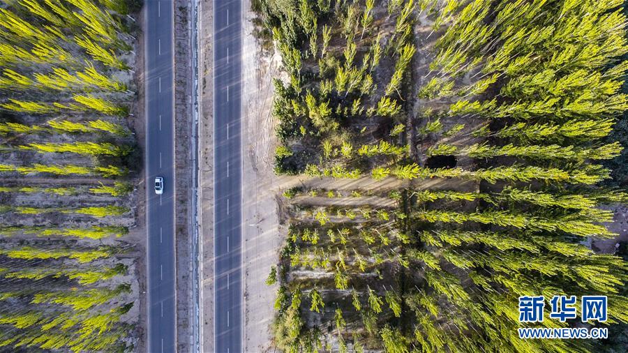 車輛行駛在新疆阿克蘇地區(qū)柯柯牙綠化工程核心區(qū)(9月20日無人機拍攝)。 在世界第二大流動性沙漠——塔克拉瑪干沙漠西北邊,一條逾百萬畝的人工林帶傲然挺立。 這條林帶就是柯柯牙荒漠綠化工程。它是新疆阿克蘇黃沙漫漫和碧波萬頃的分界嶺。 1986年,為改變惡劣的自然條件,阿克蘇啟動柯柯牙綠化工程。30年間,各族干部群眾攜手奮斗,曾是沙塵暴策源地的柯柯牙綠樹成蔭;并以此為原點,在南疆戈壁荒灘上孕育出百萬畝的“綠?!?。 30多年來,阿克蘇打造出“人走政不息”的樣本,使綠色發(fā)展理念成為幾代人的廣泛共識;“自力更生、艱苦奮斗、無私奉獻(xiàn)”的柯柯牙精神,已融入各族兒女血液中;“以林養(yǎng)林”“邊綠化邊脫貧”的綠化、脫貧方式,給其他荒漠地區(qū)貢獻(xiàn)了“柯柯牙智慧”。 新華社記者 胡虎虎 攝