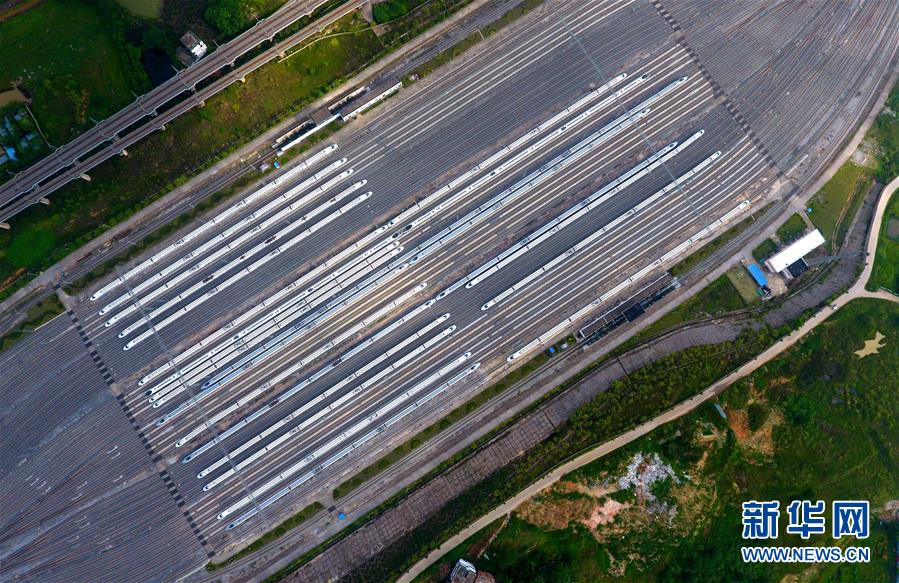 這是廣西南寧動車所內(nèi)準備發(fā)往各地的動車組列車(6月18日無人機拍攝)。 廣西壯族自治區(qū)成立60年來,鐵路建設(shè)發(fā)生翻天覆地的變化。來自中國鐵路南寧局集團有限公司的數(shù)據(jù)顯示,1958年廣西鐵路總里程為1346.3公里,如今廣西鐵路總里程達5191公里。廣西與周邊相鄰省份間實現(xiàn)動車“公交化”開行。此外,北部灣港—重慶班列、東盟海產(chǎn)品冷鏈班列、“百色一號”果蔬專列等的開通和運營,強化了鐵路供給的針對性和有效性。鐵路成為助推廣西經(jīng)濟社會快速發(fā)展的“大動脈”。 新華社記者黃孝邦攝