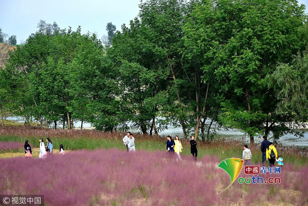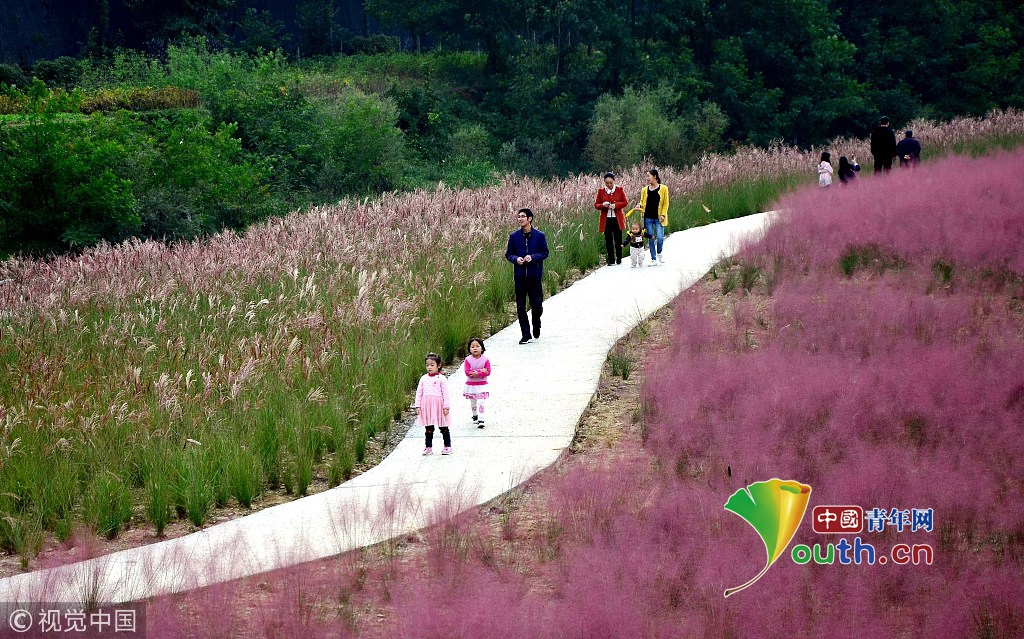 中國青年網(wǎng)北京10月7日電 2018年10月6日,游客在“粉色田野”里游玩、留影。粉黛亂子草是一種觀賞草種,該植物夏季為主要生長季,全株綠色,花期為9月中旬至11月中旬,開花時,綠葉為底,粉紫色花穗如發(fā)絲從基部長出,遠看如紅色云霧。