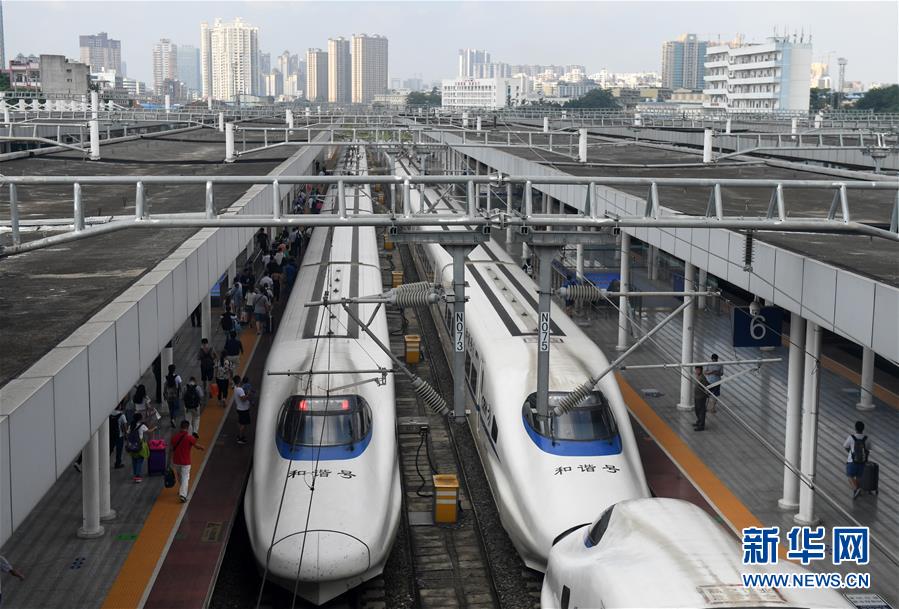 在廣西南寧站,旅客進入站臺準備乘坐動車出行(9月4日攝)。 廣西壯族自治區(qū)成立60年來,鐵路建設(shè)發(fā)生翻天覆地的變化。來自中國鐵路南寧局集團有限公司的數(shù)據(jù)顯示,1958年廣西鐵路總里程為1346.3公里,如今廣西鐵路總里程達5191公里。廣西與周邊相鄰省份間實現(xiàn)動車“公交化”開行。此外,北部灣港—重慶班列、東盟海產(chǎn)品冷鏈班列、“百色一號”果蔬專列等的開通和運營,強化了鐵路供給的針對性和有效性。鐵路成為助推廣西經(jīng)濟社會快速發(fā)展的“大動脈”。 新華社記者陸波岸攝