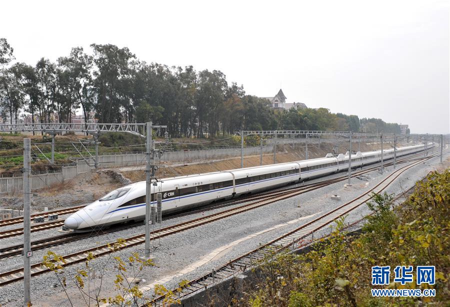 廣西桂林至北京高鐵列車在桂林市靈川縣境內(nèi)行駛(2013年12月28日攝)。 廣西壯族自治區(qū)成立60年來,鐵路建設(shè)發(fā)生翻天覆地的變化。來自中國鐵路南寧局集團有限公司的數(shù)據(jù)顯示,1958年廣西鐵路總里程為1346.3公里,如今廣西鐵路總里程達5191公里。廣西與周邊相鄰省份間實現(xiàn)動車“公交化”開行。此外,北部灣港—重慶班列、東盟海產(chǎn)品冷鏈班列、“百色一號”果蔬專列等的開通和運營,強化了鐵路供給的針對性和有效性。鐵路成為助推廣西經(jīng)濟社會快速發(fā)展的“大動脈”。 新華社記者陸波岸攝