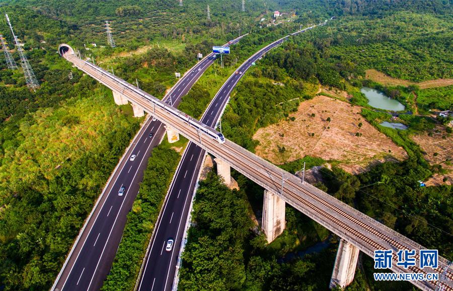 這是2016年10月11日無人機拍攝的海南環(huán)島高鐵東線三亞段。新華社記者 楊冠宇 攝