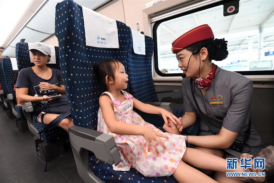 在南寧東站,一名列車工作人員在和一名小朋友交流(2017年8月5日攝)。 廣西壯族自治區(qū)成立60年來,鐵路建設(shè)發(fā)生翻天覆地的變化。來自中國(guó)鐵路南寧局集團(tuán)有限公司的數(shù)據(jù)顯示,1958年廣西鐵路總里程為1346.3公里,如今廣西鐵路總里程達(dá)5191公里。廣西與周邊相鄰省份間實(shí)現(xiàn)動(dòng)車“公交化”開行。此外,北部灣港—重慶班列、東盟海產(chǎn)品冷鏈班列、“百色一號(hào)”果蔬專列等的開通和運(yùn)營(yíng),強(qiáng)化了鐵路供給的針對(duì)性和有效性。鐵路成為助推廣西經(jīng)濟(jì)社會(huì)快速發(fā)展的“大動(dòng)脈”。 新華社記者陸波岸攝