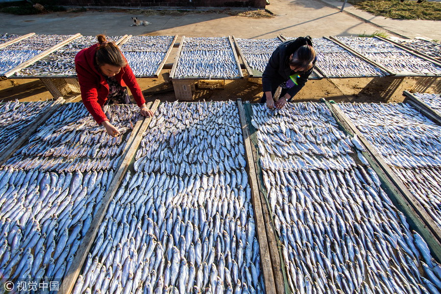 鄱陽(yáng)湖畔漁民趁秋光晾魚蝦