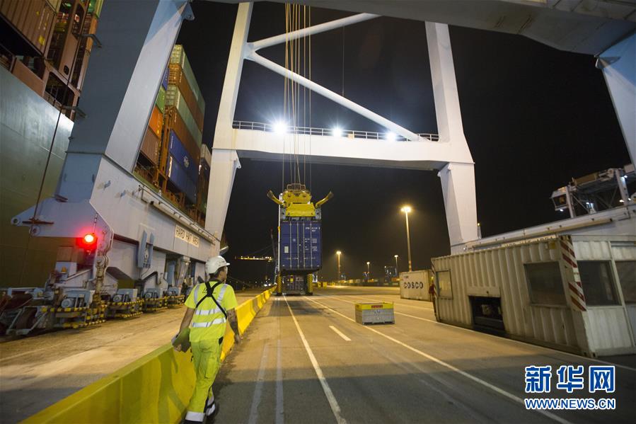10月15日晚,一名工人在比利時澤布呂赫港集裝箱碼頭工作。 新華社記者 葉平凡 攝