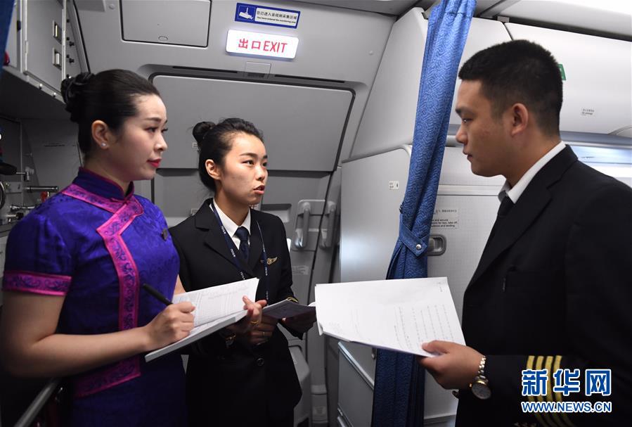 10月16日,湯春燕(中)參加航前機(jī)組協(xié)同準(zhǔn)備會(huì)。 新華社記者王全超攝