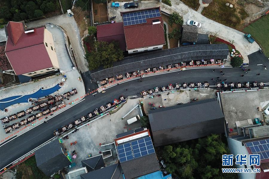 10月17日,村民與賓客在龍峰民族村參加“長桌宴”(無人機(jī)拍攝)。 當(dāng)日,在浙江省桐廬縣莪山畬族鄉(xiāng)龍峰民族村,一百桌宴席沿道路擺成一字長蛇陣,四方賓客和當(dāng)?shù)卮迕褚黄鹌穱L著具有畬族特色的菜肴,場(chǎng)面頗為壯觀。 新華社記者 黃宗治 攝
