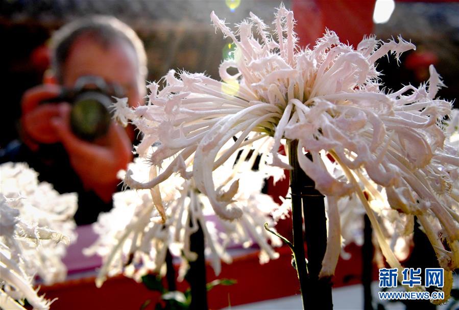 10月17日,游客在開(kāi)封清明上河園內(nèi)拍攝展出的菊花。重陽(yáng)時(shí)節(jié),各色菊花競(jìng)相綻放,把古都開(kāi)封裝點(diǎn)得分外秀美,吸引眾多游客前來(lái)觀賞游玩。 新華社記者 李安 攝
