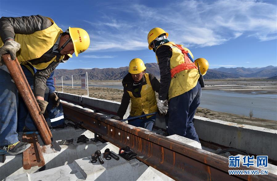 中鐵十一局的工人在川藏鐵路拉林段昌果特大橋進行鋪軌作業(yè)(10月16日攝)。 近日,川藏鐵路拉薩至林芝段昌果特大橋開始鋪設行軌排、架設梁片,標志著川藏鐵路拉林段正式進入鋪軌階段。 新華社記者 覺果 攝